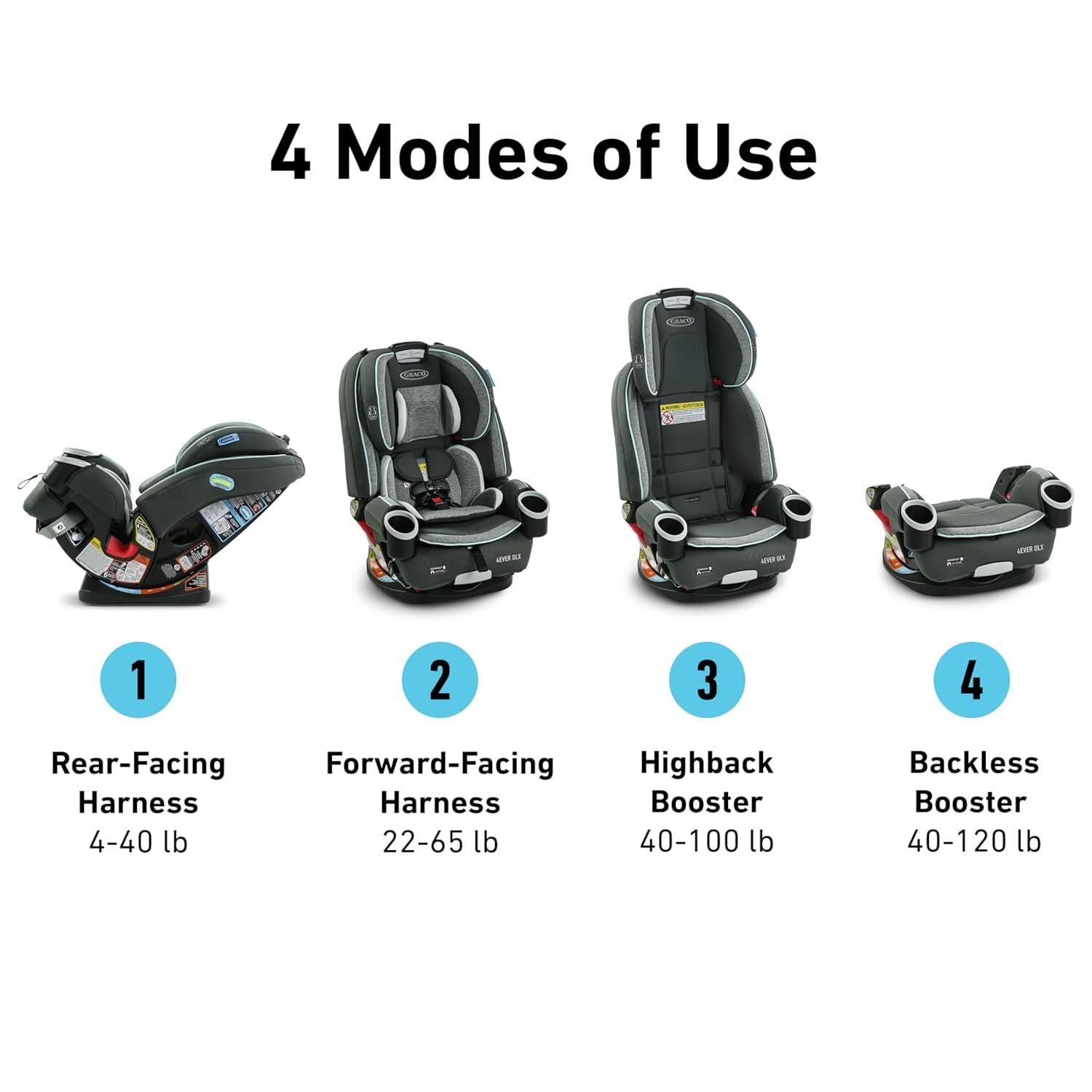 The Graco 4Ever DLX SnugLock Grow 4-in-1 Car Seat gives you 10 years of use with one car seat. The 4-in-1 car seat grows with your child as it transitions from a rear-facing harness (4-40 lb) to forward-facing harness (22-65 lb) to highback belt-positioning booster (40-100 lb) to backless booster (40-120 lb). Our Grow technology allows the backrest to widen as the headrest rises so your growing child has the best fit and comfort at every stage. The No-Rethread Simply Safe Adjust Harness System allows you to adjust the height of the headrest and harness in one motion for just the right fit. SnugLock technology allows for a hassle-free installation in less than one minute using either vehicle seat belt or LATCH. The car seat is Graco ProtectPlus Engineered to help protect in frontal, side, rear, and rollover crashes.