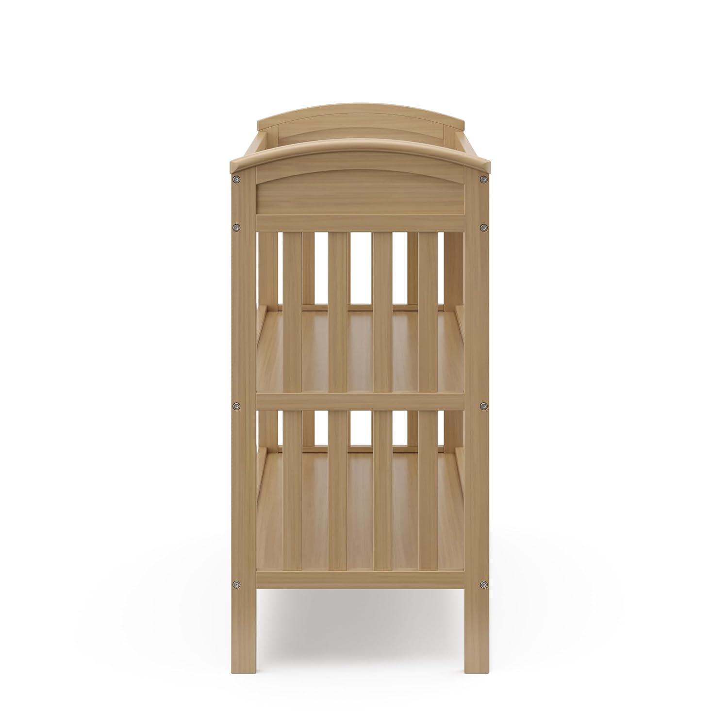 Discover the timeless elegance and ample storage of the Graco Benton Changing Table, a must-have for maintaining a beautifully organized nursery. Designed for convenience and style, this essential piece offers a dedicated space for changing your baby, paired with the practicality of keeping nursery essentials neatly arranged. Included with the Benton Changing Table is a water-resistant changing pad and a safety strap, providing both convenience and peace of mind. Boasting graceful curves and a sophisticated aesthetic, its design effortlessly complements any nursery décor. The table features two open shelves, perfect for storing bottles, diapers, lotions, and more, ensuring everything you need is within arm’s reach. Complete your Graco Benton Collection by pairing the changing table with the matching Graco Benton 6 Drawer Dresser. For a complete nursery setup, select the perfect crib to match, choosing from the Graco Benton 5-in-1 Convertible Crib, the Graco Benton 5-in-1 Convertible Crib with Drawer, or the Graco Benton 4-in-1 Convertible Crib and Changer. Each option is designed to create a cohesive and dreamy nursery environment. The Graco® Benton Changing Table is GREENGUARD Gold Certified – certified products are screened for more than 10,000 chemicals and VOCs known to pollute indoor air. The Benton Changing Table is crafted with pine wood, pine wood slats, and wood composites, and its applied finish has been tested to meet or exceed the applicable ASTM and CPSIA safety standards. Also, like all Graco® changing tables, the Bentonis JPMA Certified — meaning it’s been expert tested to meet or exceed all applicable category voluntary and mandatory safety standards. Graco® is the proud recipient of the Parent Tested Parent Approved (PTPA) Seal of Approval for nursery and children’s bedroom furniture. Backed by a 1-year limited manufacturer’s warranty. Assembly required. Changing pad included and safety strap included.
