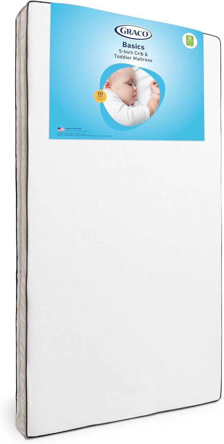 The grow-with-me Graco Essentials 6-Inch Dual-Sided Crib & Toddler Mattress is thoughtfully designed to grow with your child, as its dual-sided design features a firmer side for infants' safer sleep, and a softer side that offers more comfort for your toddler. Its ultra-soft, water-resistant outer cover is gentle to the touch and is easy to unzip for easy machine washing. GREENGUARD Gold Certified, this baby mattress has been tested for over 10,000 chemicals and VOCs to contribute to cleaner indoor air in your nursery — keeping your family top of mind. Baby Safety Alliance Verified, this Graco crib mattress has been third-party tested at an independent, CPSC-accredited laboratory to meet or exceed the highest federal and state safety standards applicable to its product category. Proudly made in the USA (with U.S. and imported materials), this dual-sided baby crib mattress features a high-density poly-fiber core (made with recycled content) and is free from fiberglass and chemical flame retardants. Designed to fit any standard full-size crib or toddler bed, the Graco 6-Inch Dual-Sided Baby Crib & Toddler Bed Mattress is backed by a 10-year limited manufacturer’s warranty.