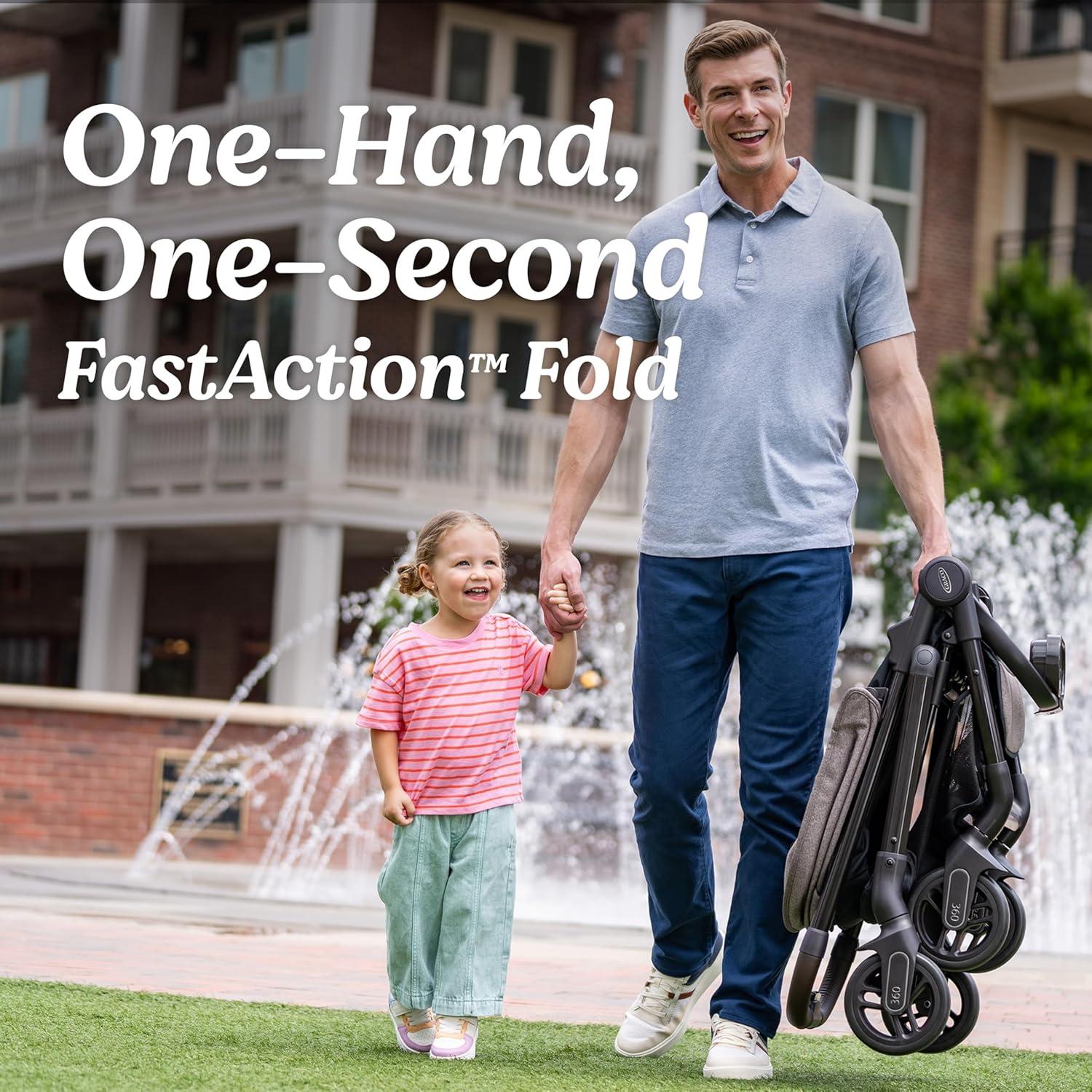 The Graco signature FastAction Fold offers a one-second, one-hand fold for quick and easy storage and transportation