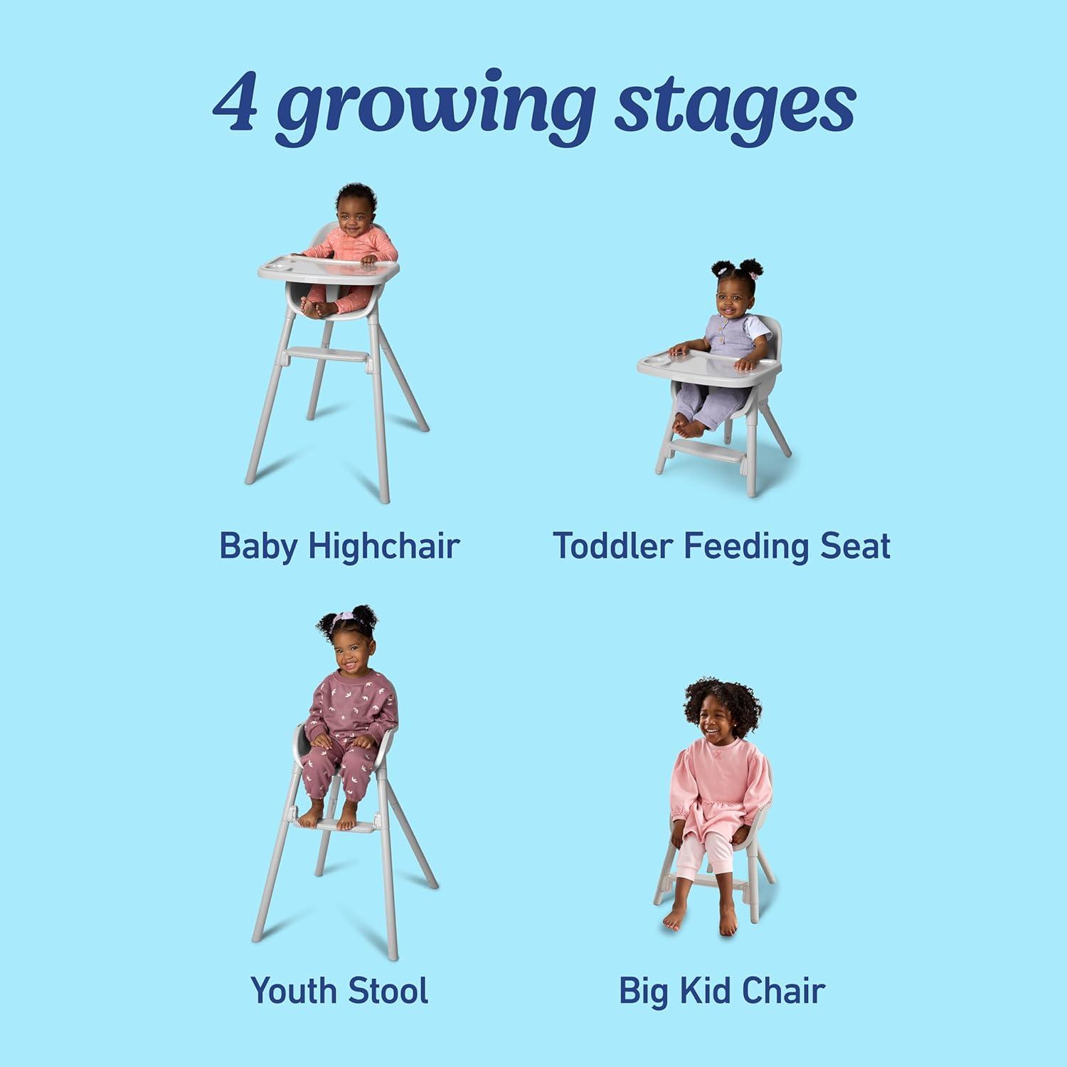 4 growing stages from baby to big kid: highchair, toddler feeding seat, youth stool, and big kid chair