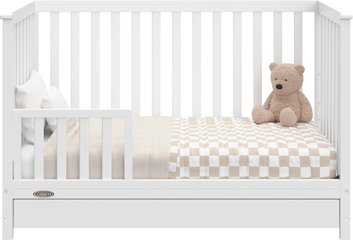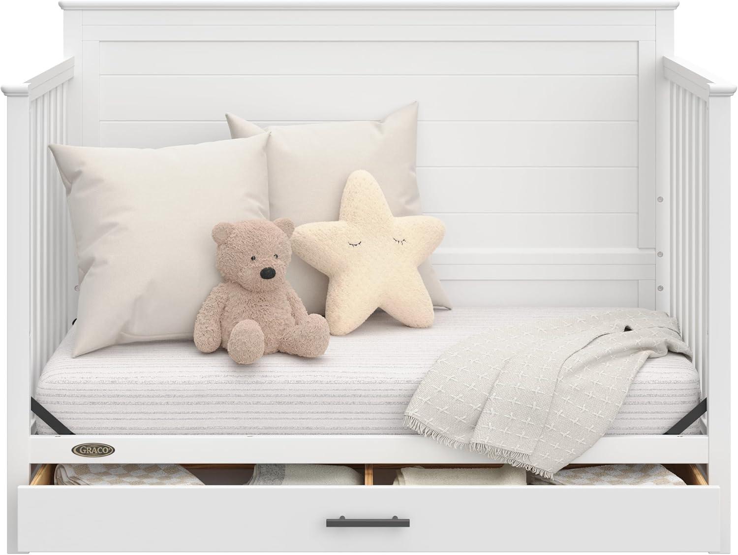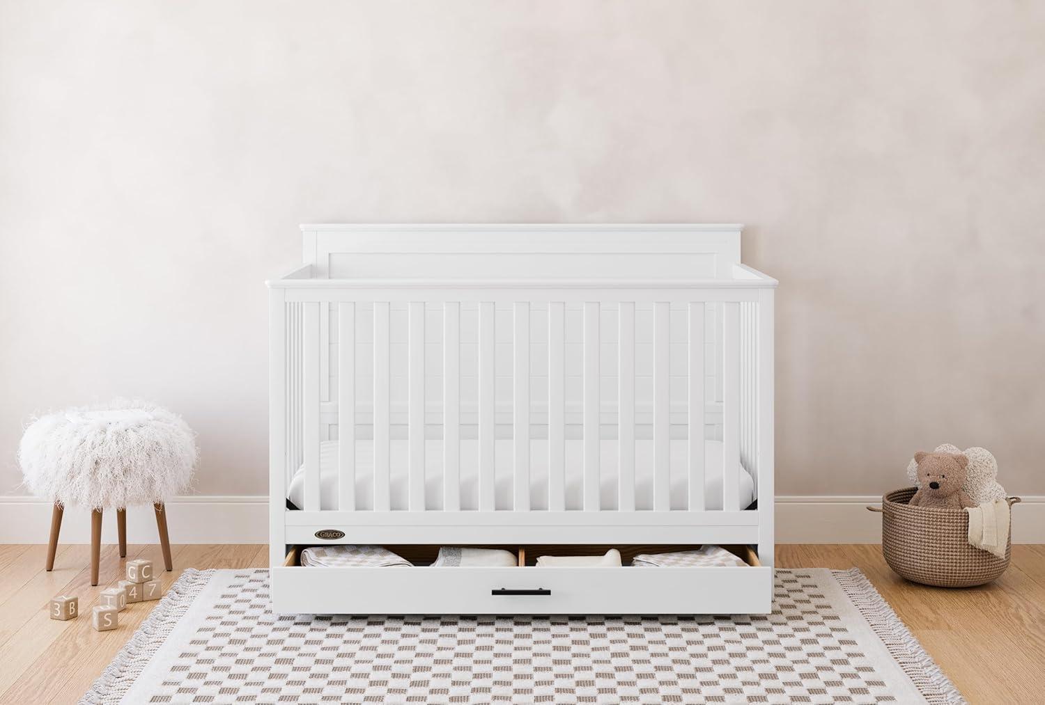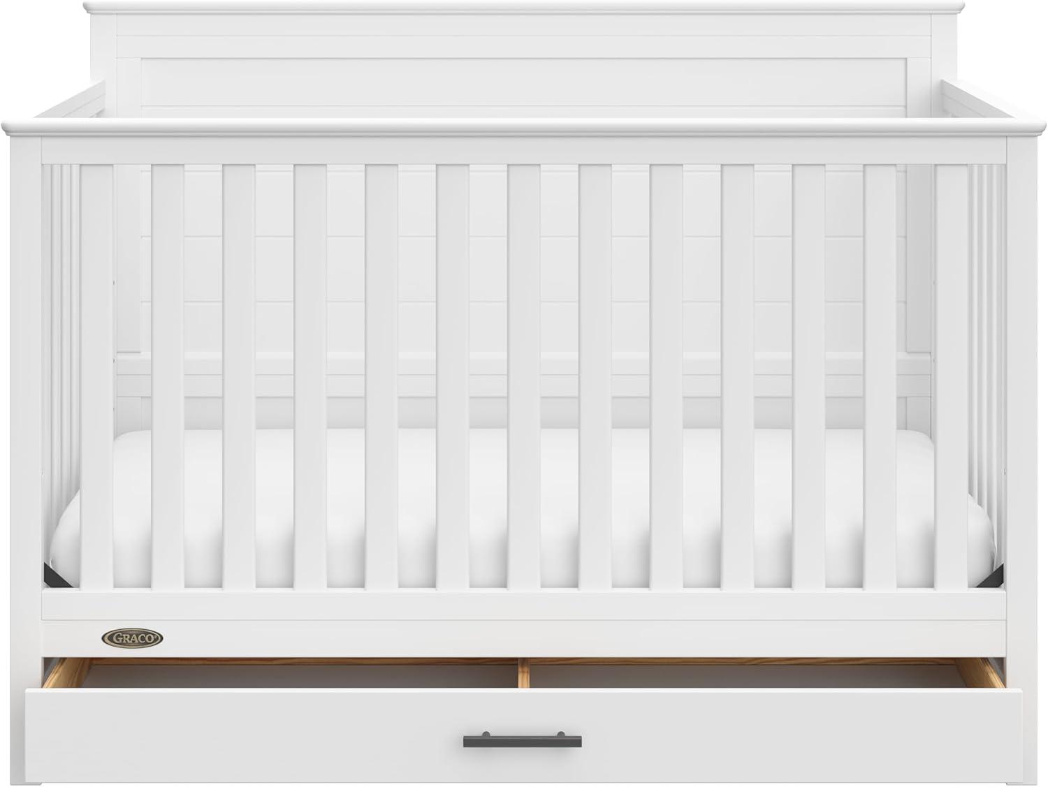 Meet our Graco Tristan 5-in-1 Convertible Crib! This elegant crib features a spacious drawer underneath with a beautiful black metal handle, perfect for storing your baby's essentials. Its solid headboard with stylish grooves and decorative molding on the top adds a timeless touch that enhances any nursery decor. Crafted from pine wood, engineered wood, and wood composites, the Tristan meets or exceeds ASTM and CPSIA safety standards and is JPMA Certified for maximum safety. Engineered to grow with your baby, this crib's adjustable mattress support base offers four height options, ensuring comfort and safety as your child grows until they can climb out or reach a height of 35 inches (89 cm). The Tristan transitions seamlessly from crib to toddler bed, daybed, and full-size bed with or without a footboard (mattress, guardrails, and full-size bed conversion kit sold separately), accompanying your child through every stage. The Graco Tristan 5-in-1 Convertible Crib is designed to accommodate any standard full-size crib & toddler mattress (mattress sold separately – we recommend any Graco crib mattress). Graco is the proud recipient of the Parent Tested Parent Approved (PTPA) Seal of Approval for nursery and children’s bedroom furniture. Backed by a 1-year limited manufacturer’s warranty. Assembly required. Mattress and toddler safety guardrails each sold separately.